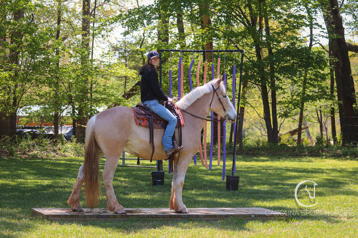 On the trails and outside of the ring is where Boulder shines. He is up for any adventure and is always reliable. He is safe in traffic, around hounds, on steep hills, and on treacherous terrains. He pops over logs, coupes, stone walls, and ditches bravely. He will ride alone, in a group, and will stand patiently when asked. He is very used to loading up and going new places to ride and camp, he steps off the trailer just as quiet as he is at home.